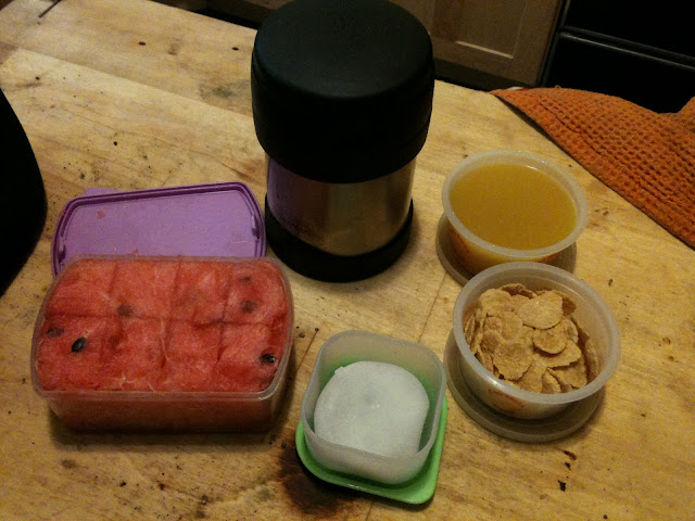To conclude, I know you are curious about the watermelon, how it fits so perfectly in the container. Here is what you do: Find a lidded container with thin sides. Slice the watermelon as thick as the container is deep, or just a bit thinner. Press the container into the slice like a cookie cutter. Cut into sections. That way, the kid gets as much melon as possible, and the pieces don't get all bruised and watery from jostling around. Happy packing!